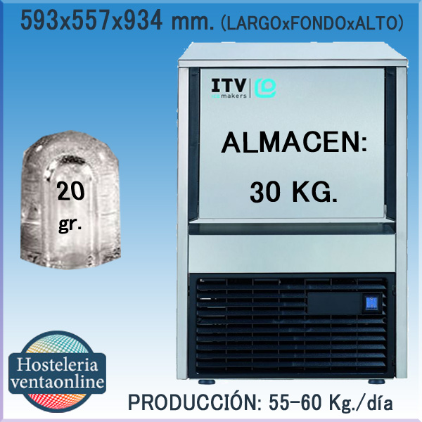Maquina de hielo con Producción 55-60 Kg/24h y cubito de 20 cm³, con cuerpo en acero inoxidable, robusto, con patas y perfecto para disponer bajo el mostrador. Enfriamiento Aire/Agua.