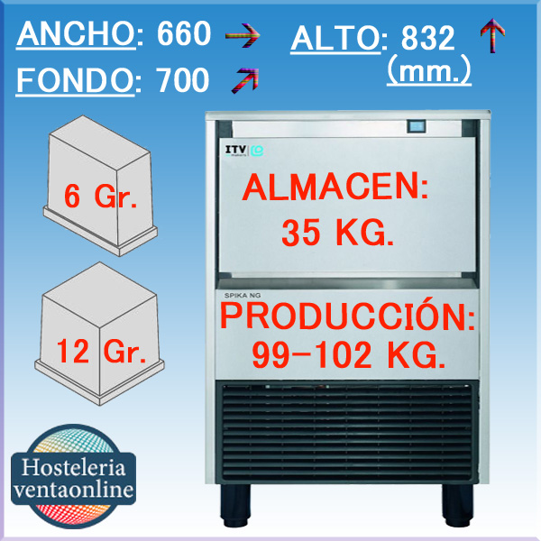 FABRICADOR DE HIELO MACIZO Y CRISTALINO SPIKA NG100 CON ALMACEN 35 KG. Y CUBITO DE 6-12 GRAMOS(ITV)