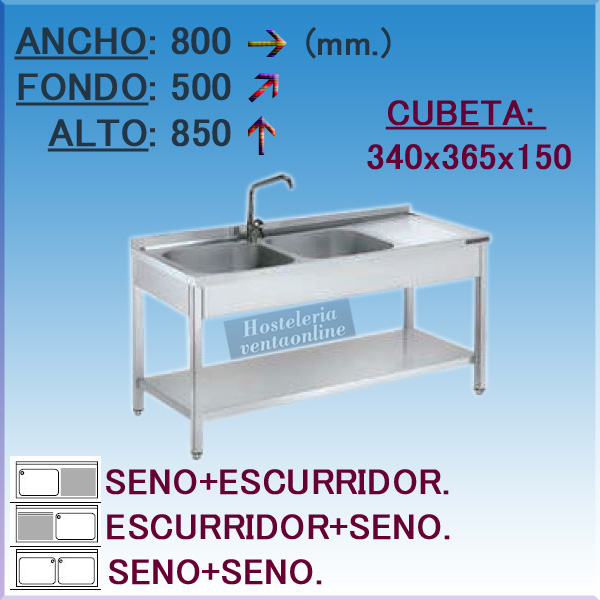 Fregadero Fondo 500 Inoxidable Semi-Industrial 800 X 500 al mejor precio, Fregadero con bastidor y patas cuadradas de 40x40 mm., fabricada en acero inoxidable en su totalidad con las cubetas embutidas y con protección insonorizante