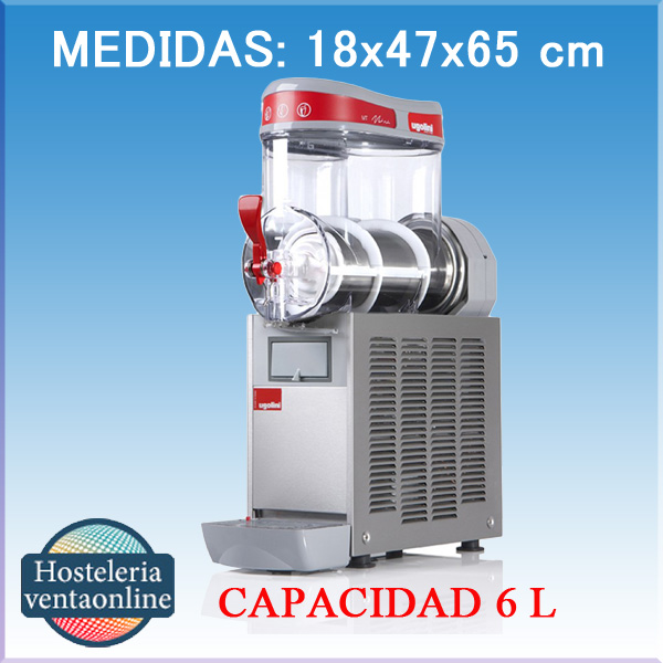 Máquina de granizados UGOLINI MT MINI 1 con una cuba de 6 litros, cuerpo de acero inoxidable, sistema de conducción magnético y compresor hermético.