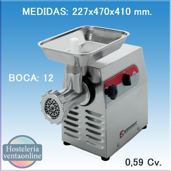 Sammic Picadora de carne PS-12, Producción de 100 Kg/h. Picadora de carne con carrocería y Tolva construidas en acero inoxidable y motor ventilado de gran solidez. La boca de entrada tiene un diámetro de 4,5 Cm.