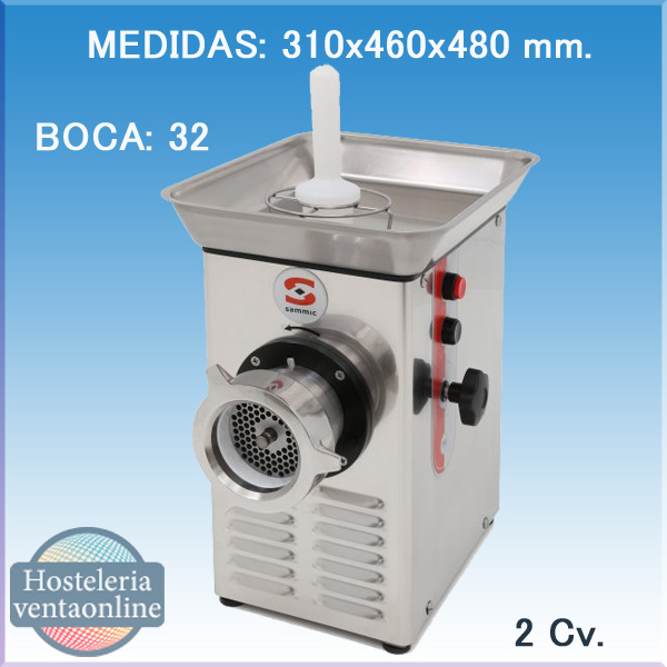 Picadora de carne PS-32 Sammic, Producción de 425 Kg/h. Picadora de carne con carrocería y Tolva construidas en acero inoxidable y motor ventilado de gran solidez. La boca de entrada tiene un diámetro de 6 Cm.
