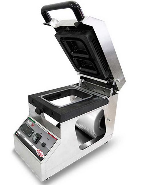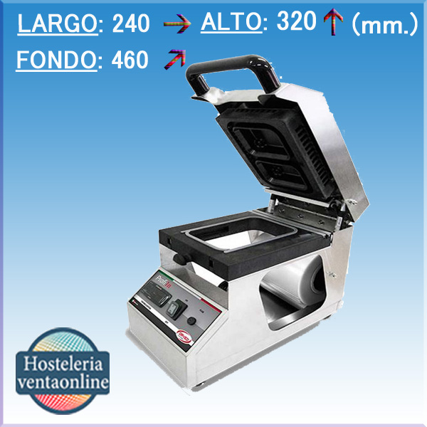 Termoselladora de barquetas, apta para moldes de barquetas con medidas: 137x190 mm. y 137x95 mm. Con carrocería en acero inoxidable, regulación electrónica de la temperatura y programación de temperatura de soldadura digital.