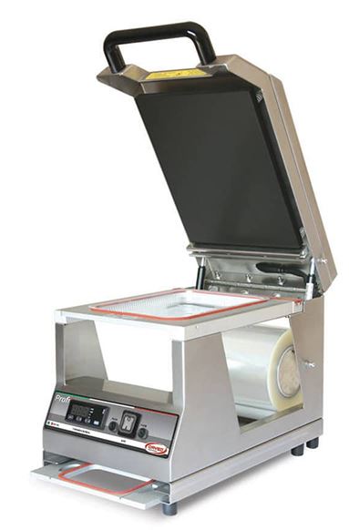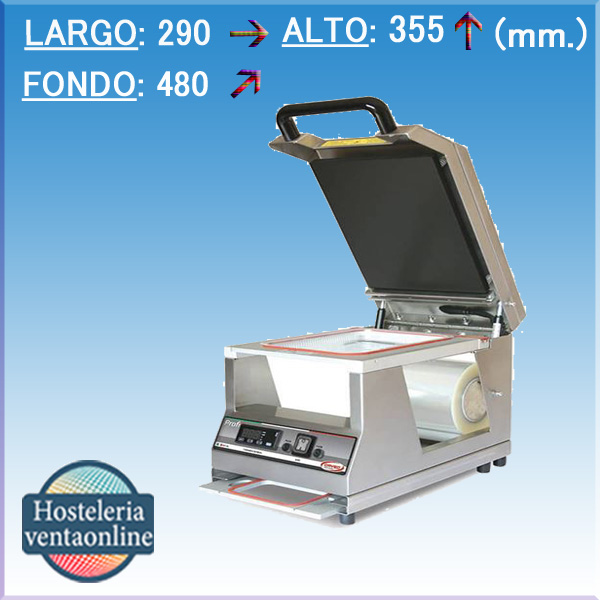 Termoselladora de barquetas, apta para moldes de barquetas con medidas: 137x95 mm, 190x137 mm, 190x260 mm. Con carrocería en acero inoxidable, regulación electrónica de la temperatura y deposito guarda-moldes.