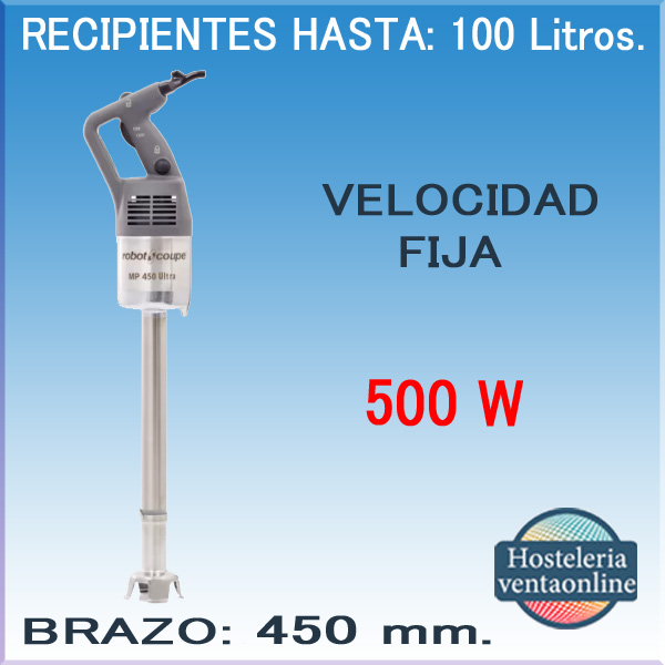 DescripciónEste Brazo Triturador MP 450 ULTRA de Robot Coupe, es especial para uso intensivo en colectividades, catering en calderos con un máximo de 100 Litros.