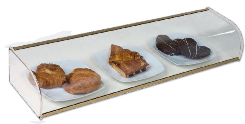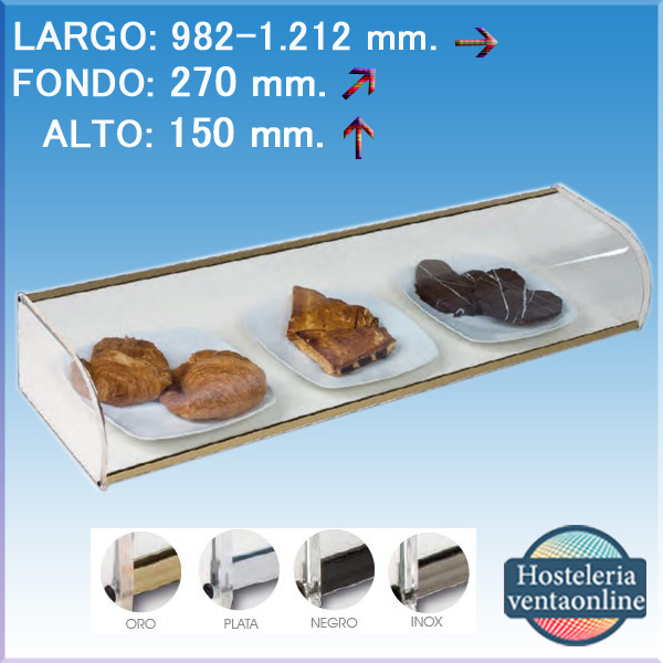 Vitrina neutra sobre mostrador para colocar los productos. Completamente CERRADA menos el lado de dentro de la barra. Esta fabricada en cristal curvo sin base y perfilería en aluminio anodizado de 15 mm. Creada para los profesionales de la hostelería; pastelerías, bares, hoteles, restaurantes, bufetes...