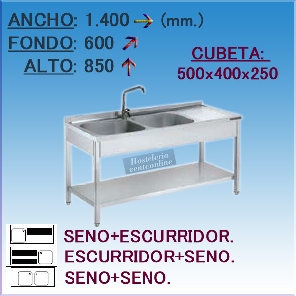 - Fregadero Industrial 1400x600 mm. - Construido en acero inoxidable. - Cubetas embutidas con protección antisonora. - Válvula desague y rebosadero. - Peto posterior de 100 mm. y frontal de 65 mm. - Los bastidores se adaptan fácilmente a los fregaderos gracias a su método de ensamblaje. Las patas cuadradas de 40x40 mm. de acero inoxidable están diseñadas para llegar hasta una altura de 900 mm. A LA HORA DE HACER EL PEDIDO TIENE QUE ESPECIFICAR EN EL LADO QUE QUIERE EL SENO. |