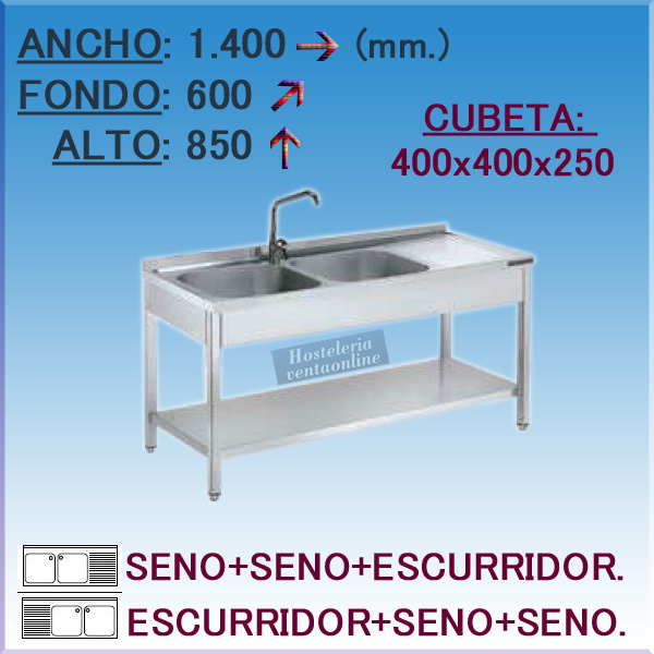 - Fregadero Industrial 1400x600 mm. - Construido en acero inoxidable. - Cubetas embutidas con protección antisonora. - Válvula desague y rebosadero. - Peto posterior de 100 mm. y frontal de 65 mm. - Los bastidores se adaptan fácilmente a los fregaderos gracias a su método de ensamblaje. Las patas cuadradas de 40x40 mm. de acero inoxidable están diseñadas para llegar hasta una altura de 900 mm. A LA HORA DE HACER EL PEDIDO TIENE QUE ESPECIFICAR EN EL LADO QUE QUIERE EL SENO. |
