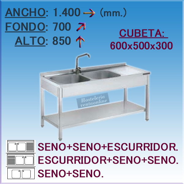 - Fregadero Industrial 1400x700 mm. - Construido en acero inoxidable. - Cubetas embutidas con protección antisonora. - Válvula desague y rebosadero. - Peto posterior de 100 mm y frontal de 65 mm. - Los bastidores se adaptan fácilmente a los fregaderos gracias a su método de ensamblaje. Las patas cuadradas de 40x40 mm. de acero inoxidable están diseñadas para llegar hasta una altura de 900 mm. A LA HORA DE HACER EL PEDIDO TIENE QUE ESPECIFICAR EN EL LADO QUE QUIERE EL SENO. |