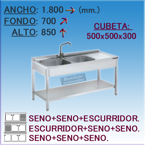 Fregadero Industrial en Acero Inoxidable 1800x700x850 mm.