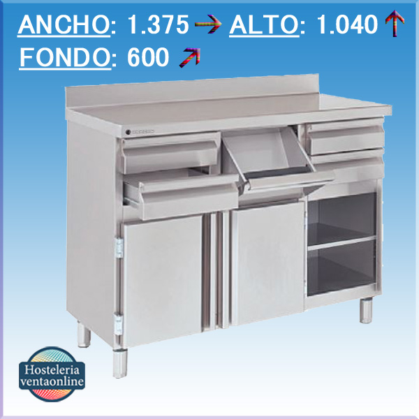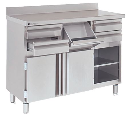 El Mueble Mesa Cafetera MCC-140 de Coreco, está fabricado en acero inoxidable AISI 304. Está equipado con 1 Tolva, 4 Cajones y 2 Puertas para guardar utensilios y mantener el orden dentro de la cocina.