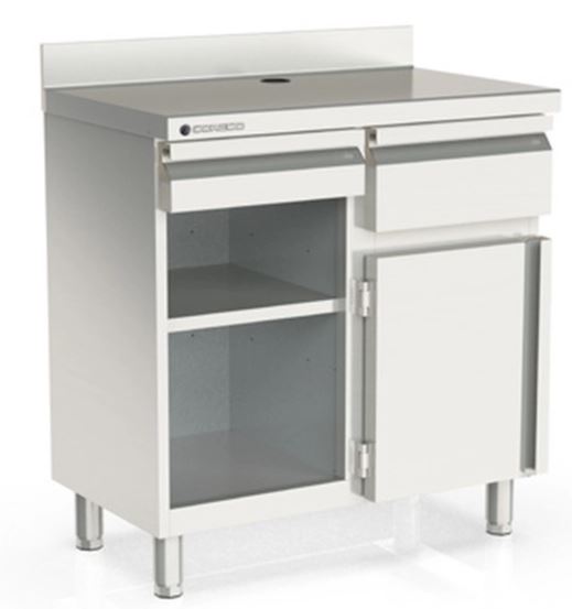El Mueble Mesa Cafetera SMC-100 de Coreco, está fabricado en acero inoxidable AISI 304. Está equipado con 1 Tolva, 1 Cajon y 1 Puerta para guardar utensilios y mantener el orden dentro de la cocina.