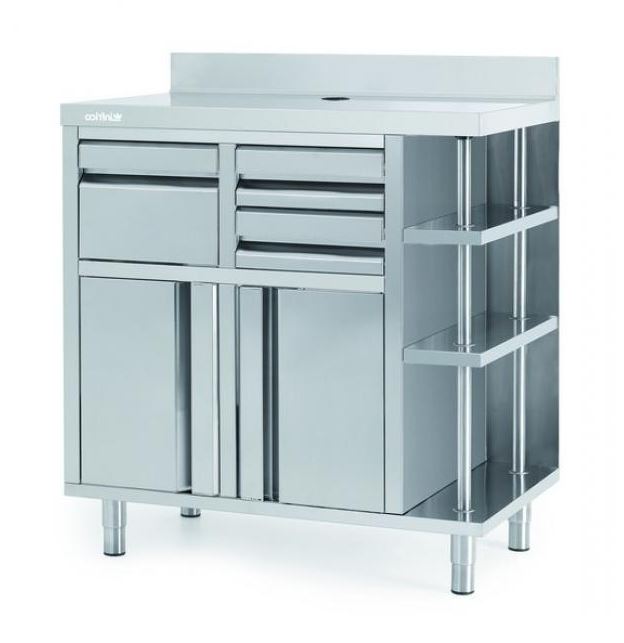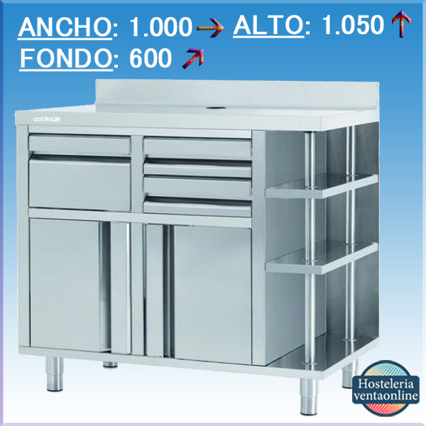 El Mueble Mesa Cafetera MCAF 1000 CI de Infrico está fabricado en acero inoxidable AISI 304. Está equipado con cajones, puertas y 3 estantes para guardar diferentes utensilios de cocina. La separación entre estantes es de 33, 22,5 y 20 cm. También dispone de tolva con tirador integrado para recoger los posos de café.
