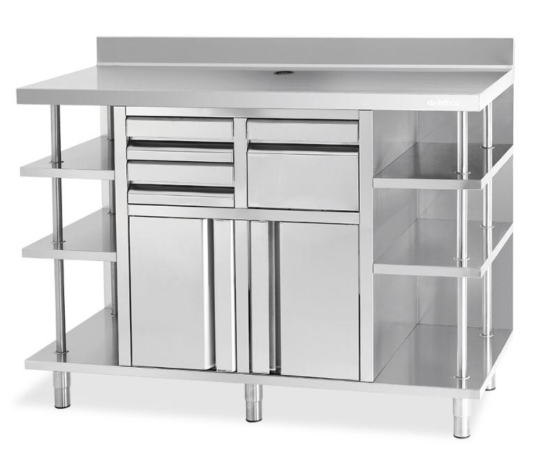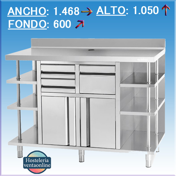 El Mueble Mesa Cafetera MCAF 1500 de Infrico está fabricado en acero inoxidable AISI 304. Está equipado con 2 cajones, 2 puertas y 1 tolva con el tirador integrado. Tiene estantes a ambos lados.