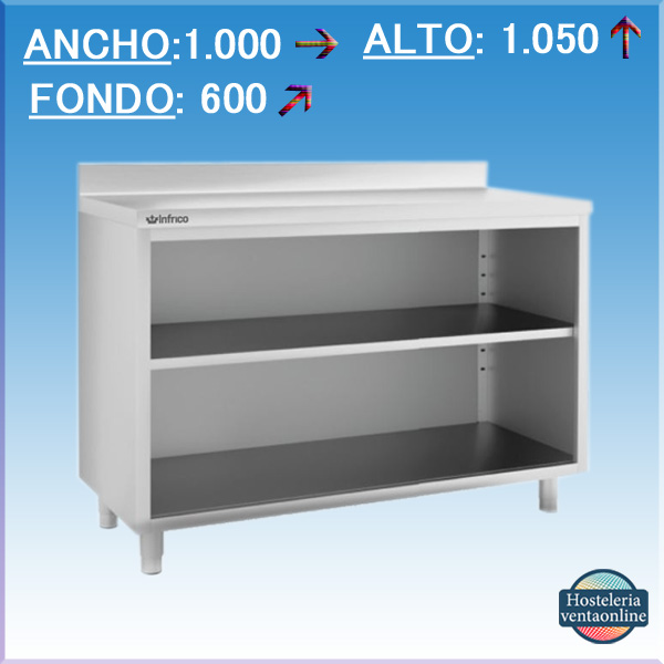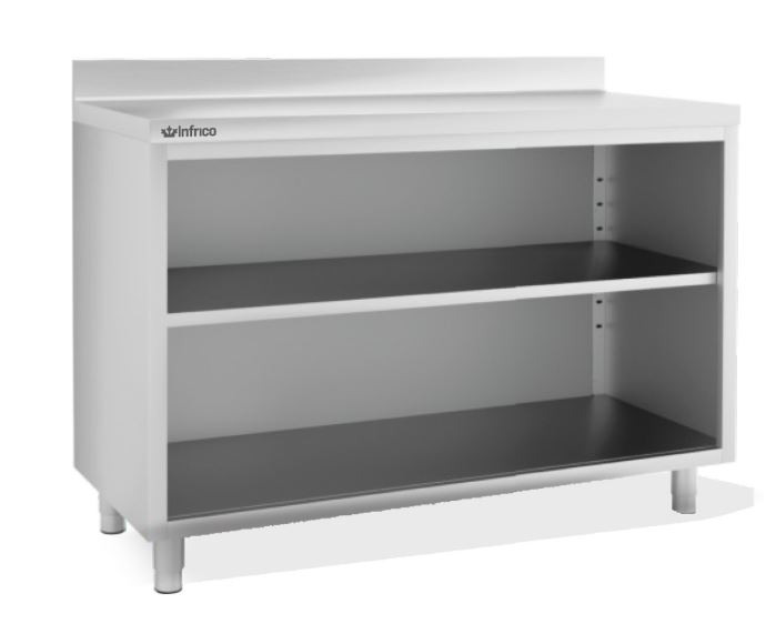 Mueble Mesa Estanteria IEST100 de Infrico fabricado en acero inoxidable AISI 304. La característica principal de este material es que resiste de forma óptima a la corrosión y al uso frecuente.