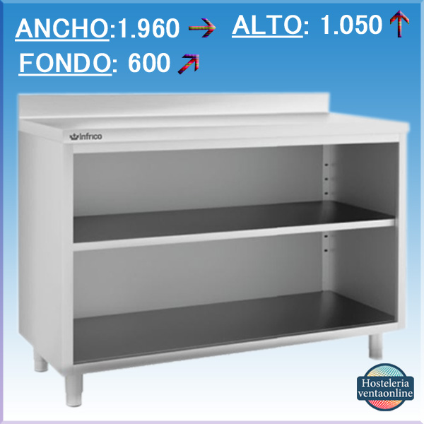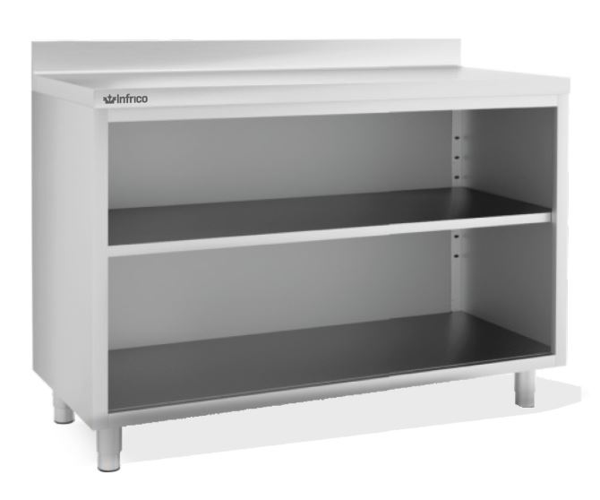 Mueble Mesa Estanteria IEST200 de Infrico fabricado en acero inoxidable AISI 304. La característica principal de este material es que resiste de forma óptima a la corrosión y al uso frecuente.