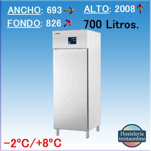 Armario Frigorífico con 1 puerta para Hostelería, con estantes de 650x530 mm. y 700 Litros de capacidad, fabricación exterior e interior en acero inoxidable AISI 304.