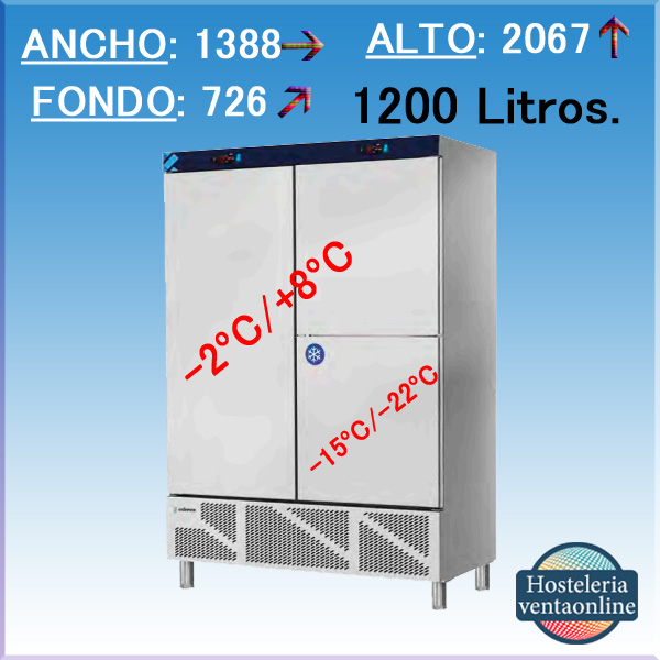 Armario Refrigerado de 3 puertas con compartimento para Congelados ideal para Hostelería, con estantes de 560x542 mm y 1200 Litros de capacidad, fabricación exterior e interior en acero inoxidable AISI 304.