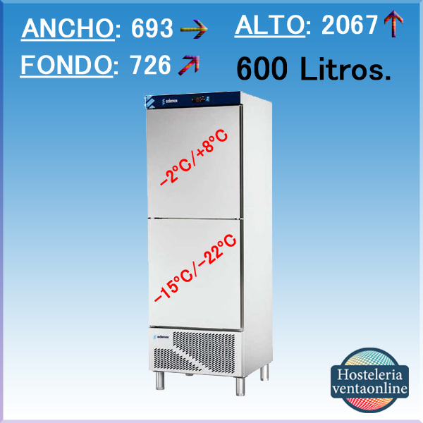 Armario Refrigerado de 2 1/2 puertas con compartimento para Congelados ideal para Hostelería, con estantes de 560x542 mm y 600 Litros de capacidad, fabricación exterior e interior en acero inoxidable AISI 304.
