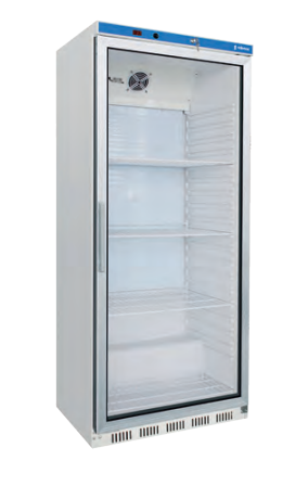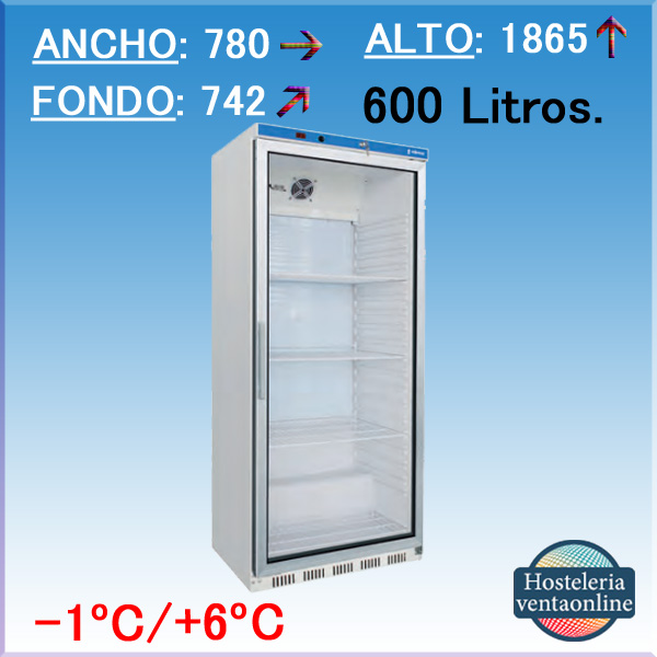 Armario Refrigeración de 1 puerta de cristal, con 3 estantes de 650x530 mm. y 600 Litros de capacidad, Puerta reversible con cerradura.