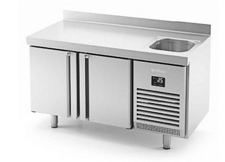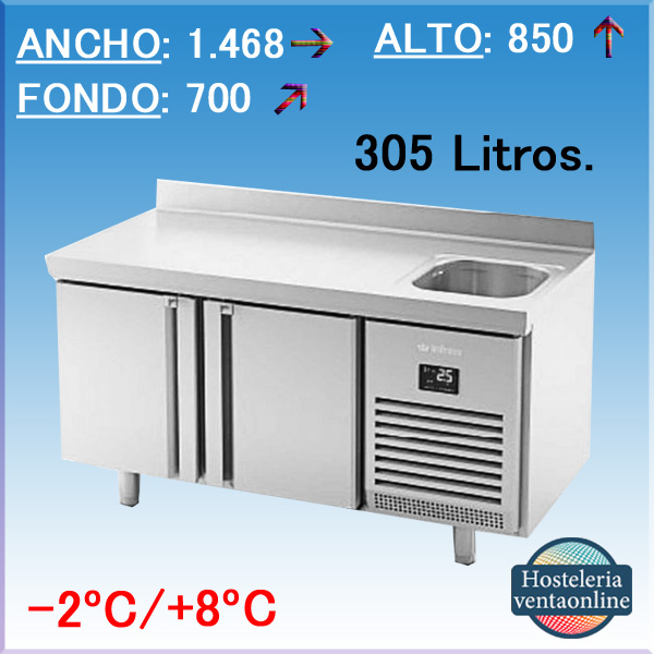 Bajomostrador con fregadero de 2 puertas y capacidad de 305 litros, con medidas: 1.468x700x850 mm. Fabricada en acero inoxidable AISI 304.Puertas ciegas.