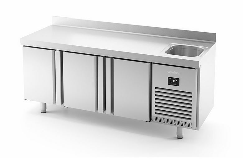 Bajomostrador con fregadero de 3 puertas y capacidad de 465 litros, con medidas: 1.960x700x850 mm. Fabricada en acero inoxidable AISI 304.Puertas ciegas.