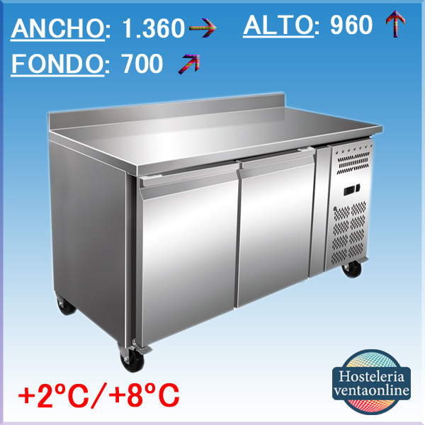 Mesa fría o bajomostrador refrigerado con 2 puertas, modelo GN2200TN, de la serie 700. Estructura totalmente inyectada, con aislamiento de poliuretano inyectado de 40 Kg/m3 de densidad. Exterior e interior en acero inoxidable. Diseño de puertas con tirador integrado, dotadas con bisagras para un retorno automático y burlete plano. Sistema de ventilación y condensación frontal. Evaporador de tiro forzado. Refrigerante R-290. Controlador digital táctil e intuitivo. Rango de temperatura de trabajo +2ºC +8ºC. 1 juego de guías y 1 parrilla por puerta en dotación.