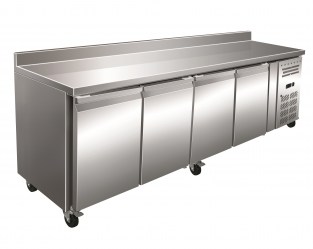 Mesa fría o bajomostrador refrigerado con 4 puertas, modelo GN4200TN, de la serie 700. Estructura totalmente inyectada, con aislamiento de poliuretano inyectado de 40 Kg/m3 de densidad. Exterior e interior en acero inoxidable. Diseño de puertas con tirador integrado, dotadas con bisagras para un retorno automático y burlete plano. Sistema de ventilación y condensación frontal. Evaporador de tiro forzado. Refrigerante R-290. Controlador digital táctil e intuitivo. Rango de temperatura de trabajo +2ºC +8ºC. 1 juego de guías y 1 parrilla por puerta en dotación.