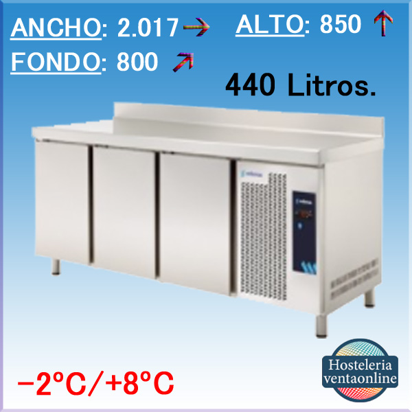 Mesa Refrigerada Gastronorm GN 1/1 de 3 puertas y capacidad de 440 litros, con medidas: 2.017x800x850 mm. Fabricada en acero inoxidable AISI 304.