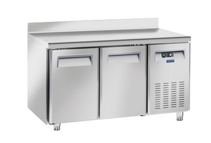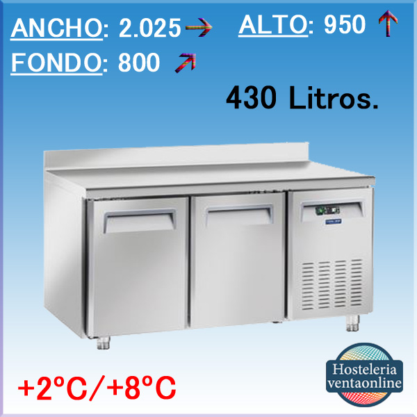 Mesa refrigerada pasteleria de 2 puertas, con peto y capacidad de 430 litros, con medidas: 2.025x800x950 mm. fabricada en acero inoxidable.Puertas ciegas.