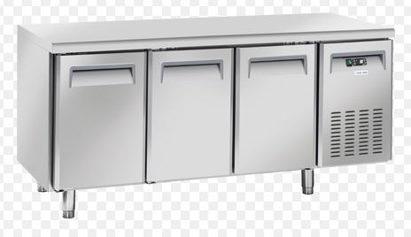 Mesa refrigerada pasteleria de 3 puertas, sin peto y capacidad de 640 litros, con medidas: 2.025x800x850 mm. fabricada en acero inoxidable.Puertas ciegas.