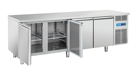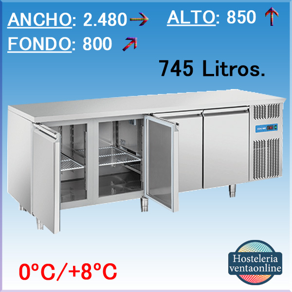 Mesa refrigerada pasteleria de 4 puertas, sin peto y capacidad de 745 litros, con medidas: 2.480x800x850 mm. fabricada en acero inoxidable.Puertas ciegas.