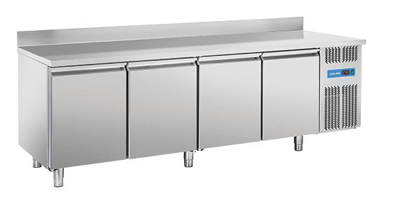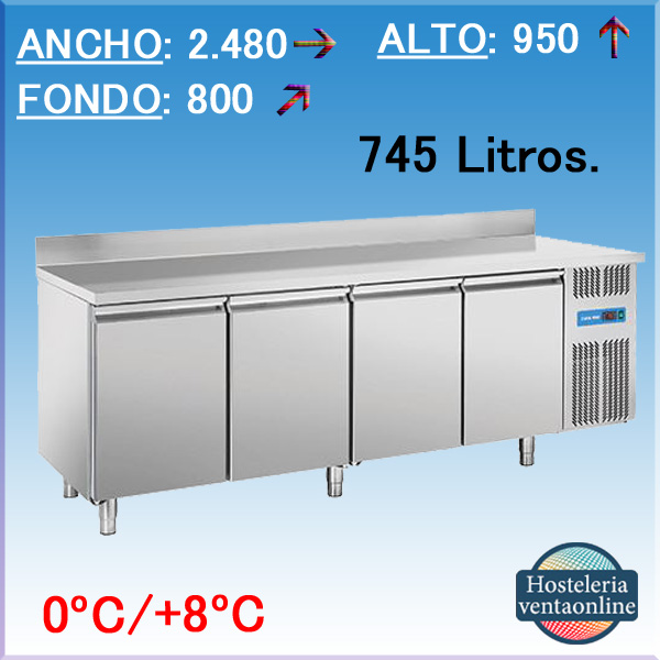 Mesa refrigerada pasteleria de 4 puertas, con peto y capacidad de 745 litros, con medidas: 2.480x800x950 mm. fabricada en acero inoxidable.Puertas ciegas.