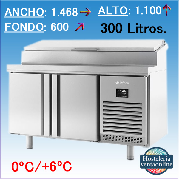 Mesa refrigerada para ensaladas de 2 puertas y capacidad de 300 litros, con medidas: 1.468x600x1.100 mm. Fabricada en acero inoxidable. Puertas ciegas.