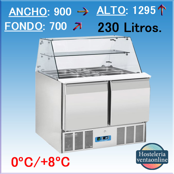 Mesa refrigerada para ensaladas de 2 puertas y capacidad de 230 litros, con medidas: 900x700x1.295 mm. Fabricada en acero inoxidable.Puertas ciegas.