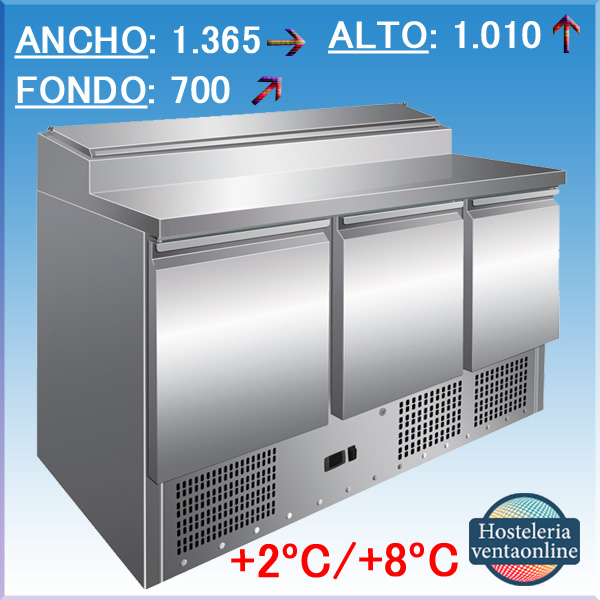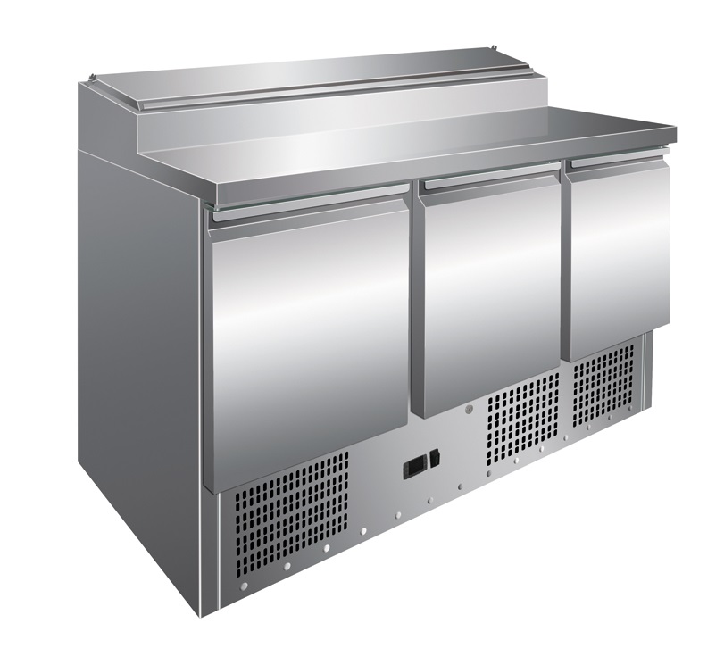 Mesa refrigerada para preparación de Ensaladas con cubetas GN 1/6, Fabricada completamente en acero inoxidable para su uso en cocinas profesionales de restaurantes, bares y, en general, negocios de hostelería. Superficie de trabajo en Acero Inoxidable.