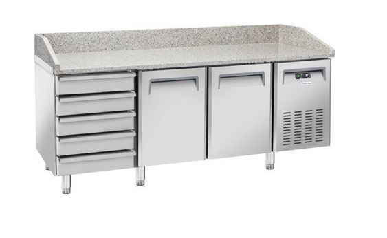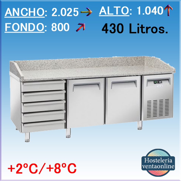 Mesa refrigerada para Pizzeria de 2 puertas y 5 cajones. Capacidad de 430 litros, con medidas: 2.025x800x1.040 mm. Fabricada en acero inoxidable.Puerta ciega.