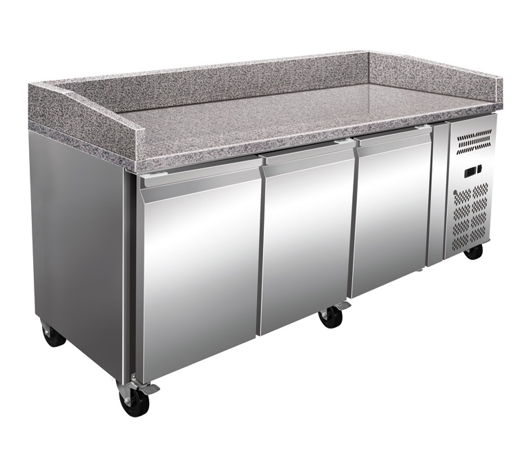 Mesa refrigerada para preparación de Pizzas con encimera de granito, Fabricada completamente en acero inoxidable para su uso en cocinas profesionales de restaurantes, bares y, en general, negocios de hostelería. Encimera de trabajo con granito.