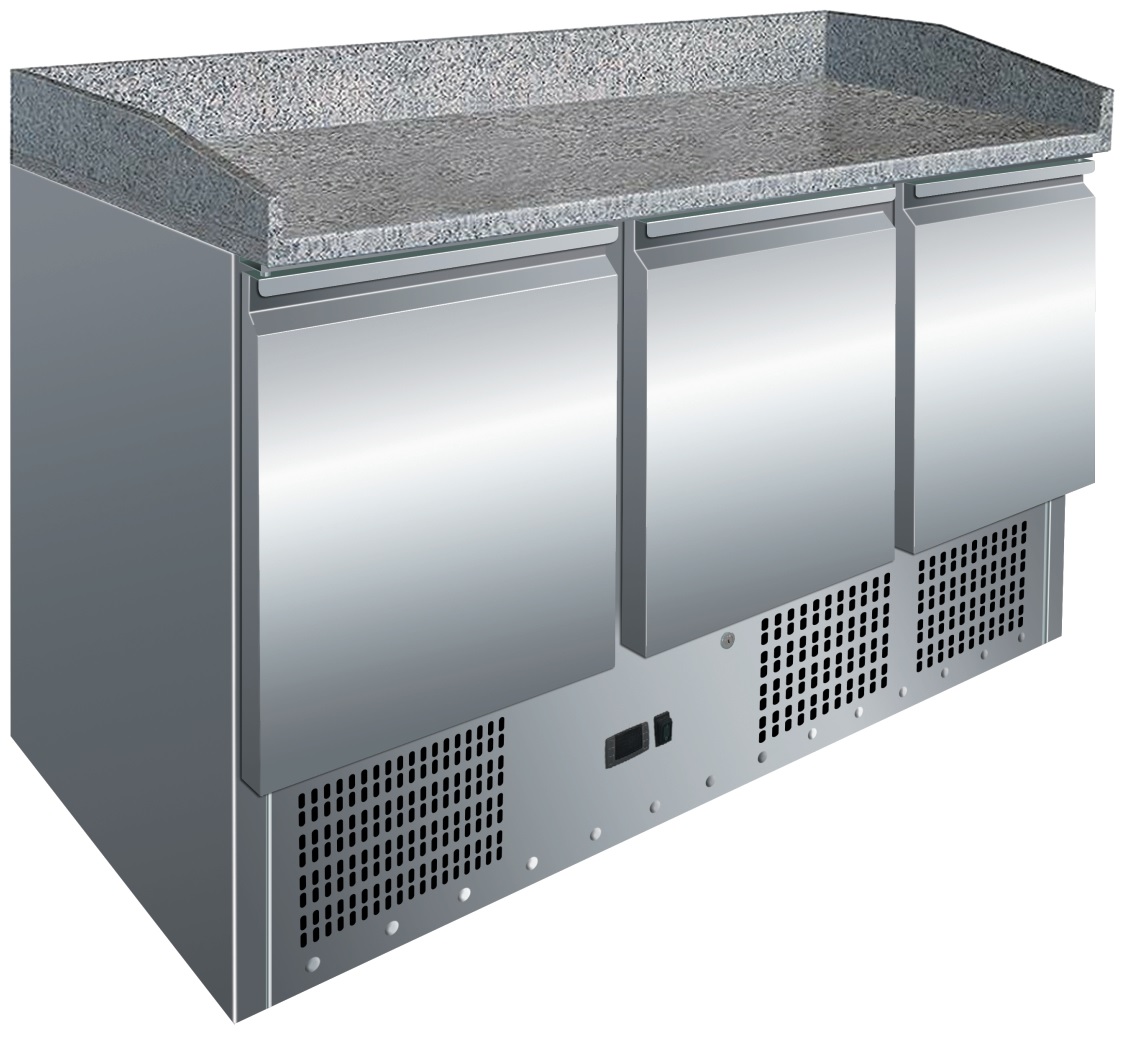 Mesa refrigerada para preparación de Pizzas con encimera de granito, Fabricada completamente en acero inoxidable para su uso en cocinas profesionales de restaurantes, bares y, en general, negocios de hostelería. Encimera de trabajo con granito. Mesa refrigerada compacta para optimizar espacio.