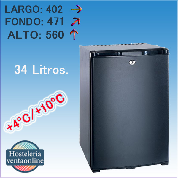 Minibar de 1 puerta ciega con capacidad de 34 litros. Sistema por ciclo de absorción para un funcionamiento silencioso.