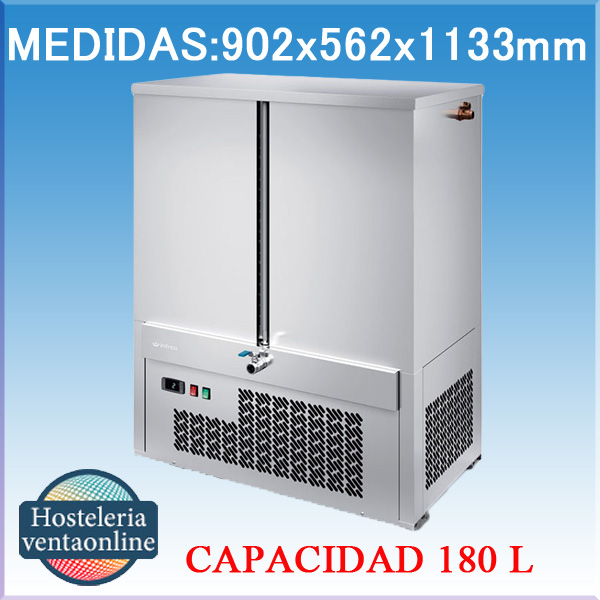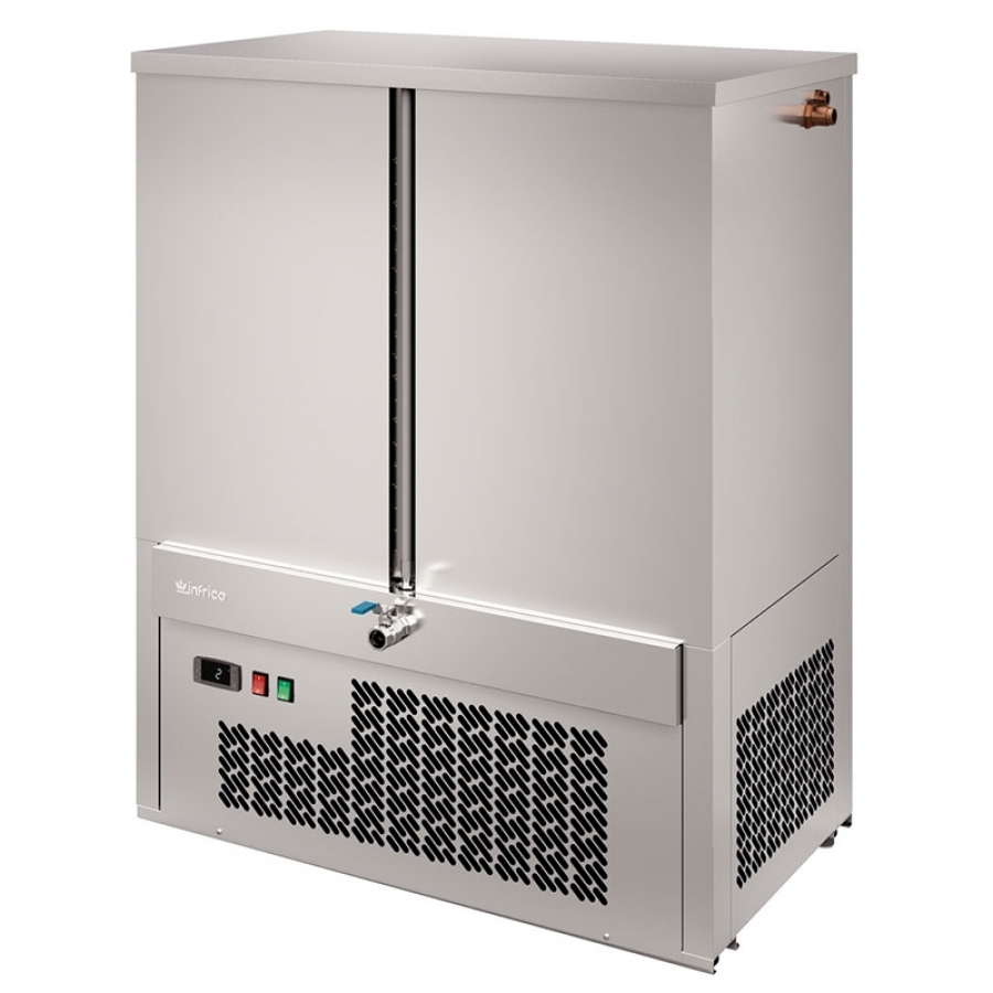 Tanque enfriador de agua vertical. Con exterior e interior en acero inoxidable y aislamiento de poliuretano inyectado. Llenado automático por boya y agitador de agua interno. Tiene un rango de temperatura de +1 a +4 ºC