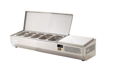 Expositor Refrigerado de ingredientes con tapa inoxidable para ensaladas y pizzas con 5 alojamientos para cubetas GN 1/4.