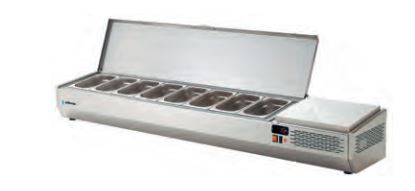Expositor Refrigerado de ingredientes con tapa inoxidable para ensaladas y pizzas con 10 alojamientos para cubetas GN 1/4.