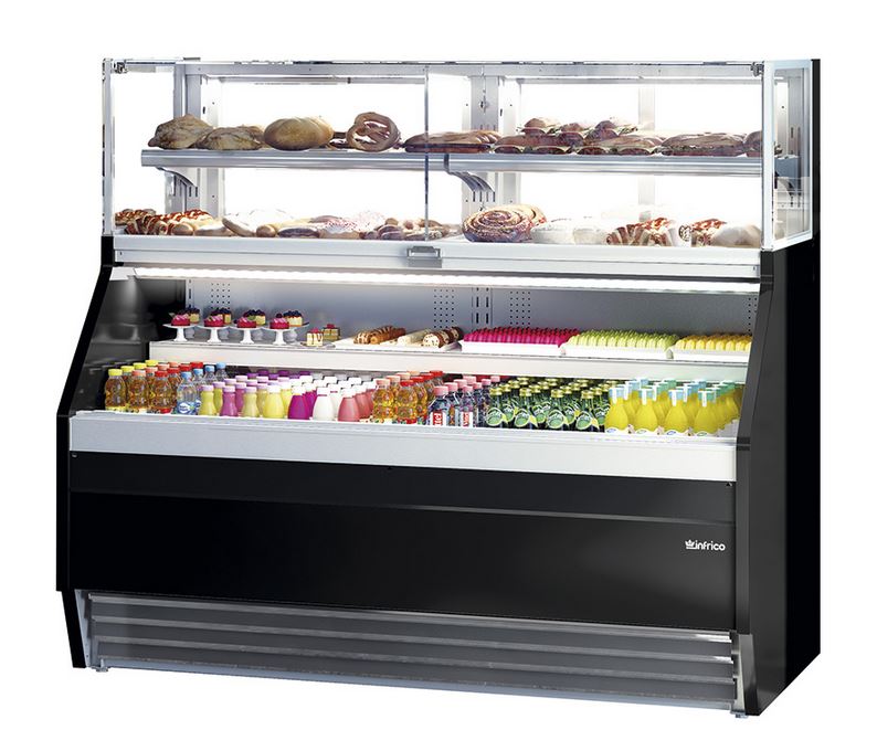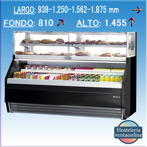 VITRINA PASTELERIA REFRIGERADA CON CRISTAL PLANO ARRIBA Y CORTINA NOCTURNA.MODELOS DE VITRINAS EXPOSITORAS PASTELERAS INFRICO SERIE COMBO: VCO9, VCO12,VCO15,VCO18.