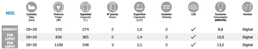 VON 9 PHT: 938x810x1.300 mm.(LargoxFondoxAlto). Temperatura: +55ºC+60ºC.