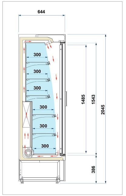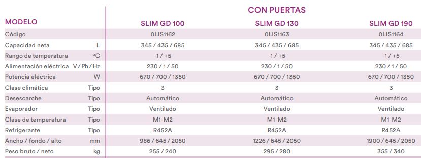 SLIM 100: 986x645x2.050 mm.(LargoxFondoxAlto). Temperatura:-1ºC+5ºC.
